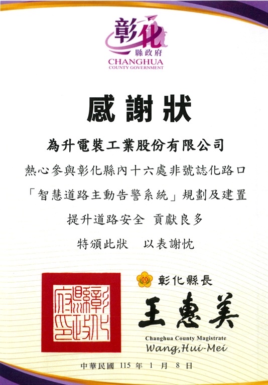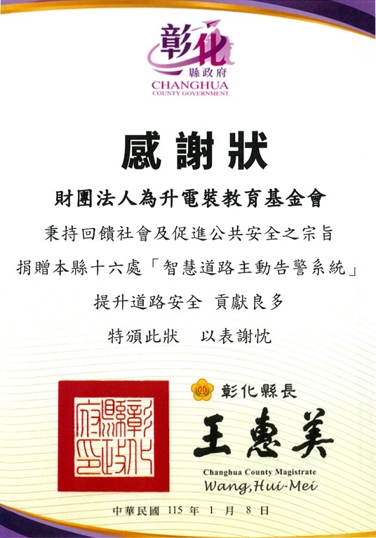 为升电装教育基金会捐赠「智慧道路主动告警系统」给彰化县,共在十六个无号志路口设置,来守护大家的交通安全。